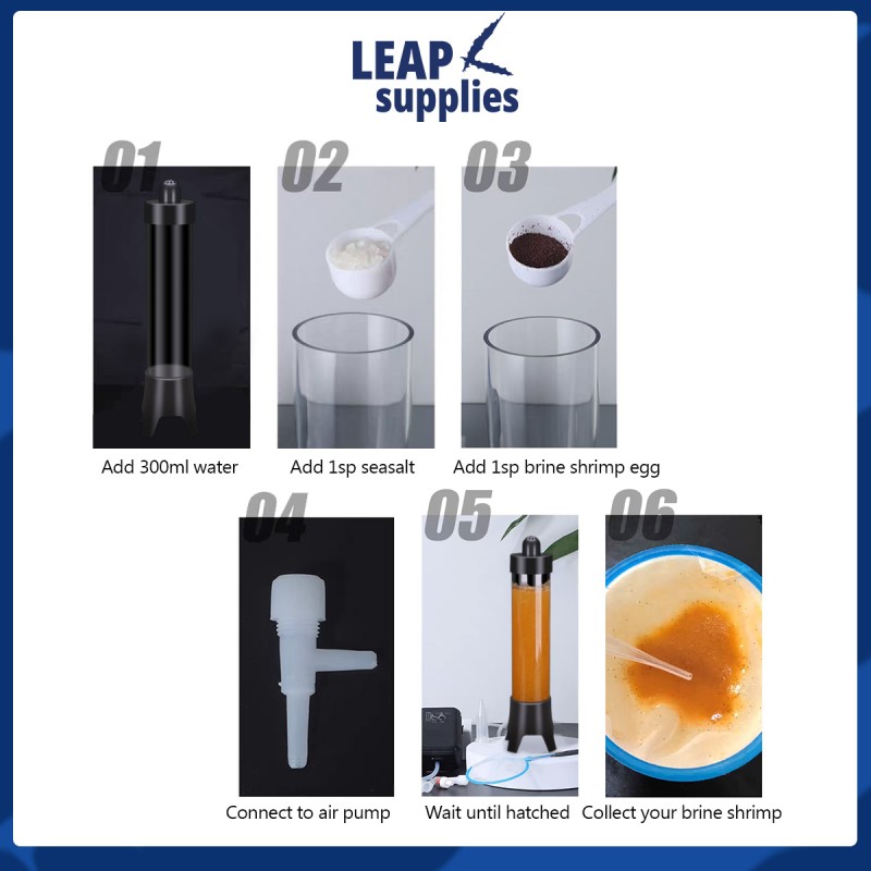 Home kit for you to hatch your brine shrimp eggs easily, efficiently. Optimised hatch rates, specially designed chamber ensures maximum circulation and oxygenation for high hatch success. This standing incubator is easy to operate and comes with a valve, no complex equipment or steps. Clear view chamber makes monitoring your hatch in real time even easier.