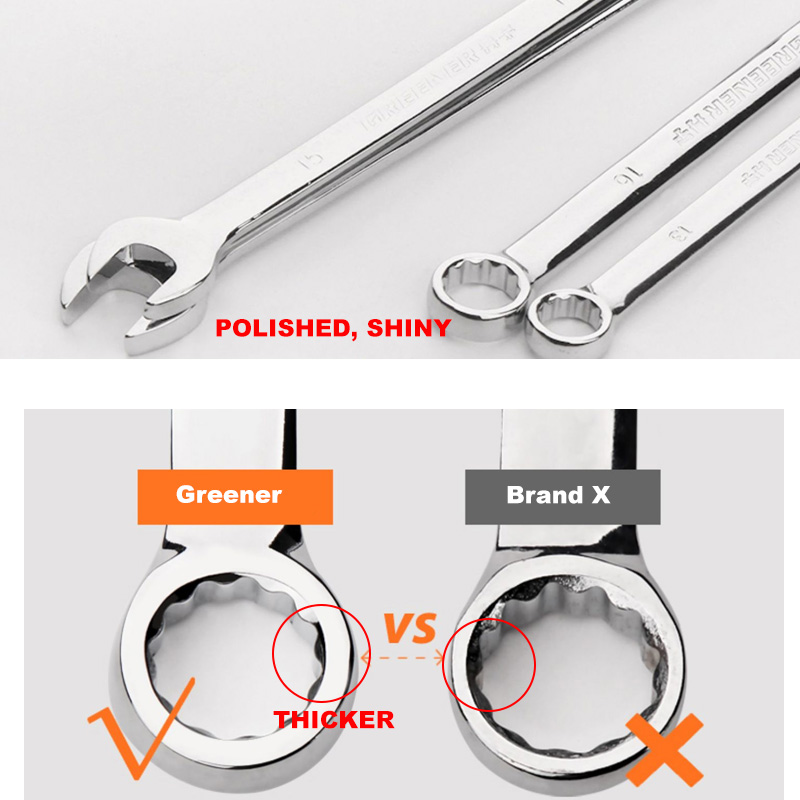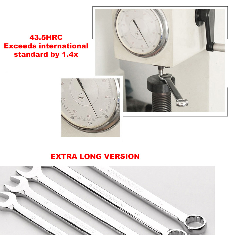 Greener Long Combination Wrench far exceeds international standard quality. The longer wrench gives you additional power, allowing you to easily open tight bolts or apply extra force with ease. The longer handle also gives you better grip on the spanner. With quality steel, it does not go out of shape easily too!