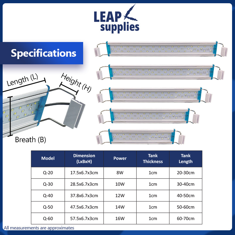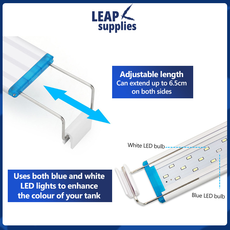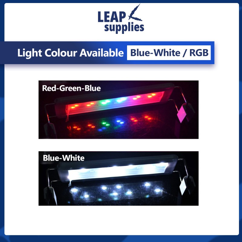 The LEAP Aquarium Adjustable Length LED Light is designed to enhance the colour and vitality of your aquatic plants and fish, making it a stunning centerpiece in any room. Energy efficient with LED bulbs, it is long lasting and bright. It comes with either white with blue LED lights or red, green, blue LED lights built in together.
