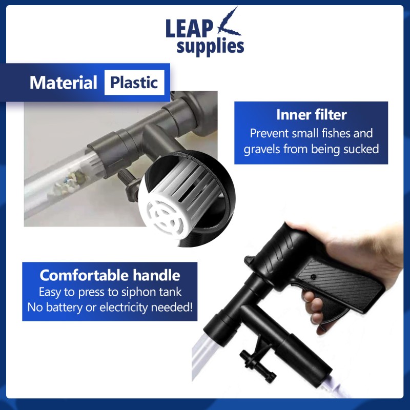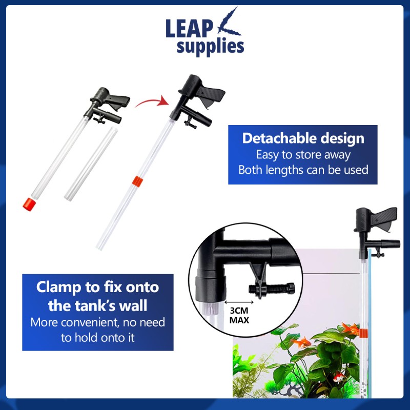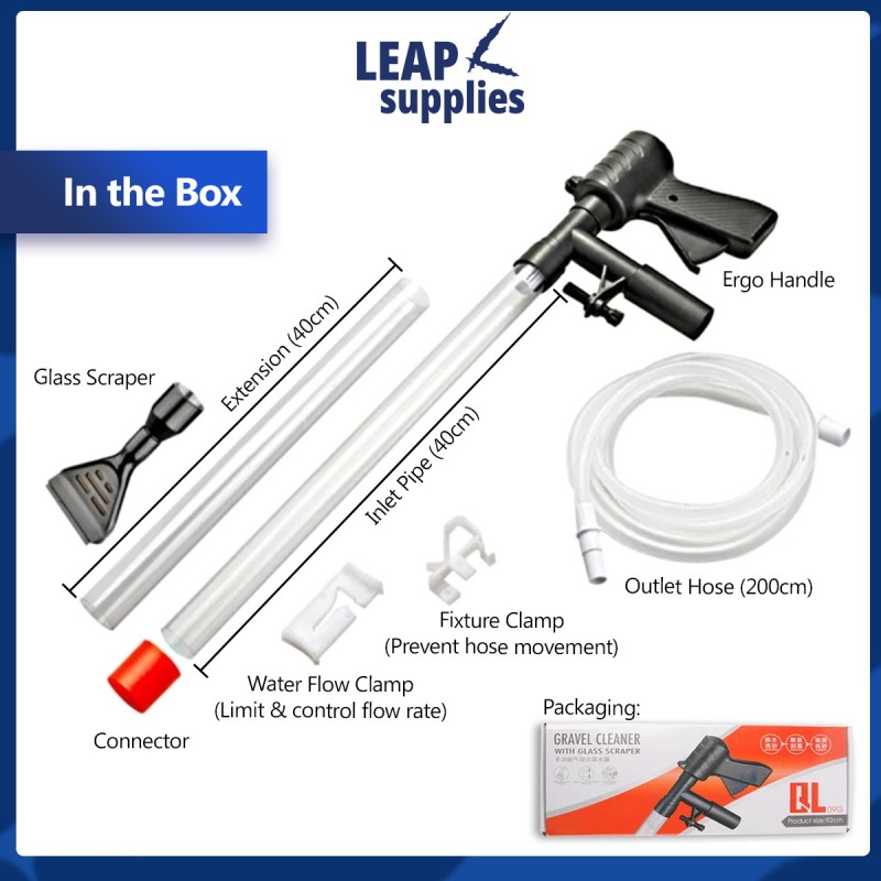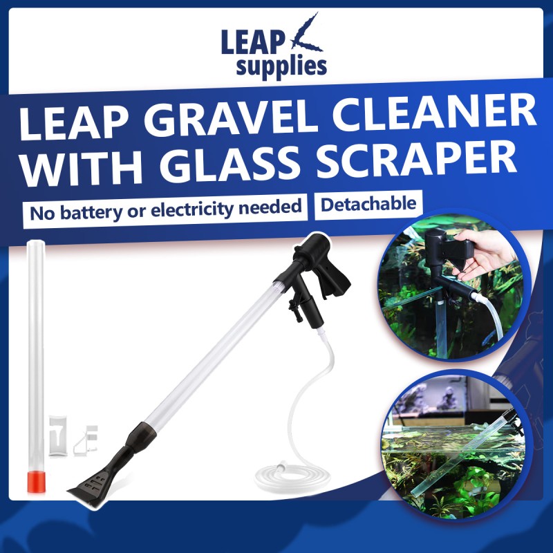 The LEAP Gravel Cleaner with Glass Scraper QL-09 is incredibly easy to use, allowing you to clean your tank quickly and efficiently. Simply press the handle for suction to siphon the tank; no battery or electricity required! Comes with two 40cm pipes that can be connected to clean larger size tanks. The gravel cleaner can be detached for compact storage.