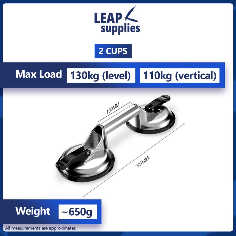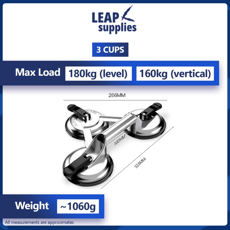 Safely and easily lift heavy tiles and glass with the LEAP Heavy Duty Glass Suction Lifter. Available in either 2 or 3 cups, it gives you strong grip on the glass without slipping. Aluminium alloy body, the suction cups do not break on dropping. Definitely for long durable usage.