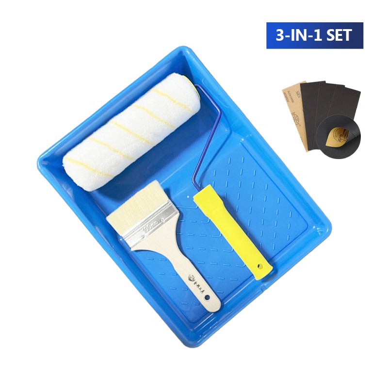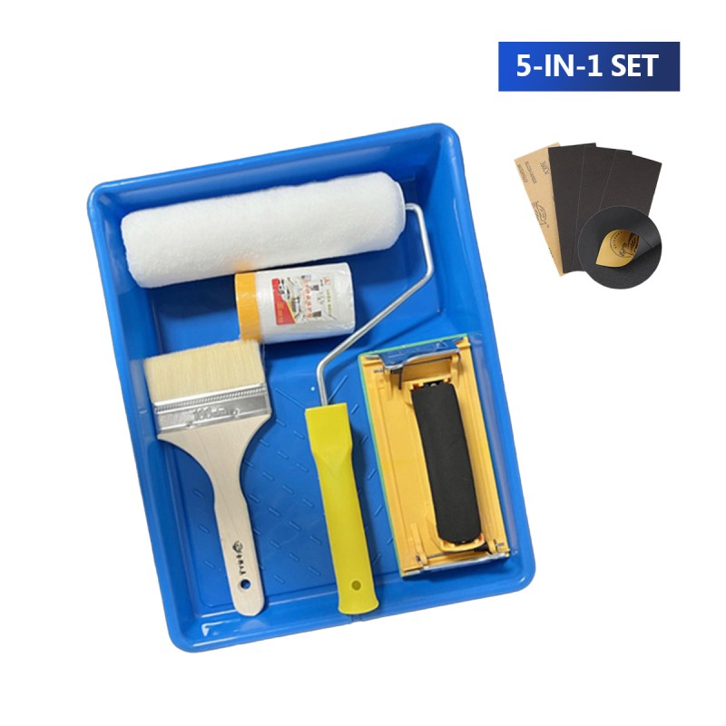 In the Set: 4" Goat Hair Brush, 9" Roller, 9" Paint Tray (3-IN-1) / +55cm Sheet, Sand Paper Holder (5-IN-1) / +1.1M Paint Rod (6-IN-1)