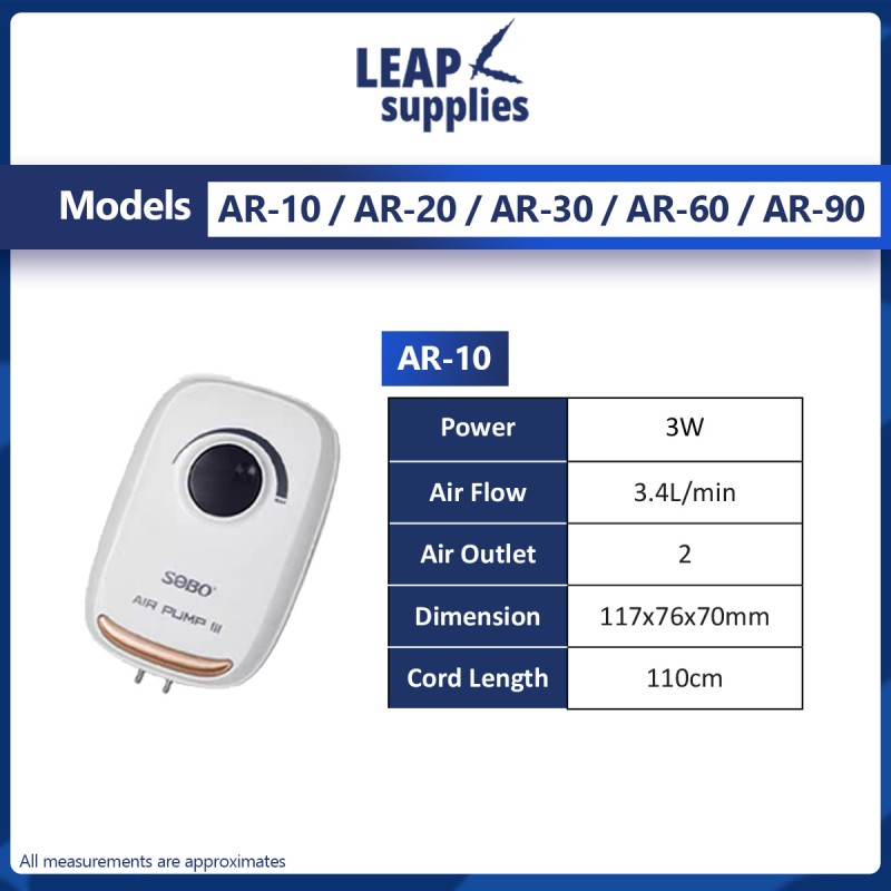 Air Flow: 3.4L/min (AR-10) / 3.5L/min (AR-20) / 4.5L/min (AR-30) / 3.5L/min (AR-60) / 4.5L/min (AR-90)