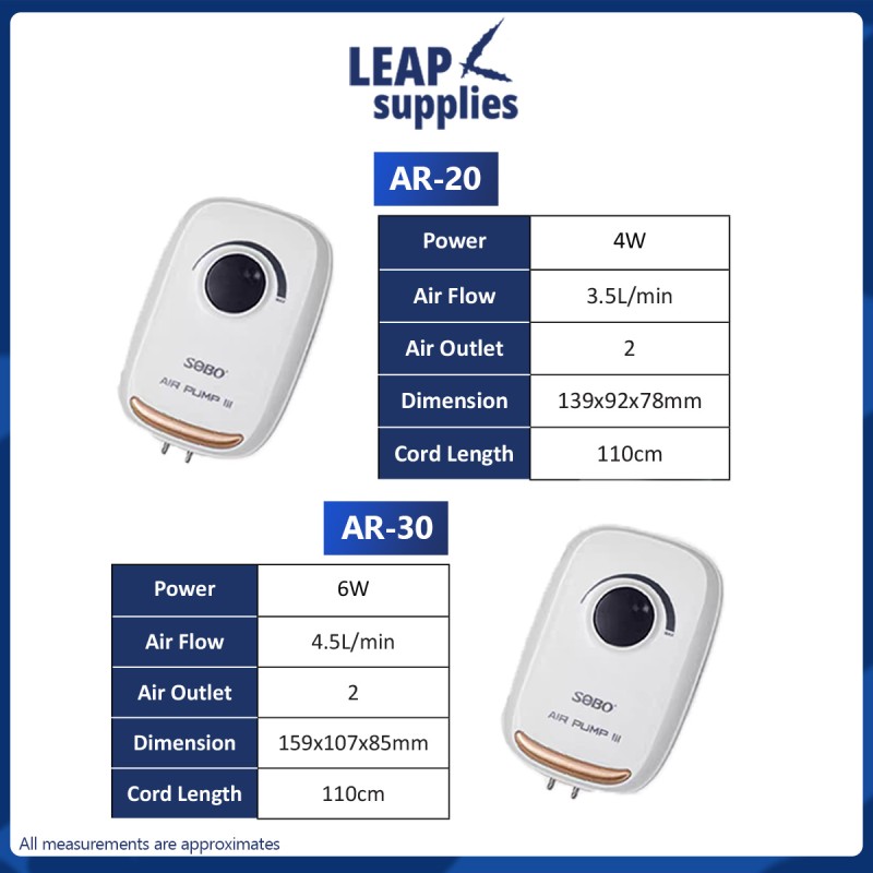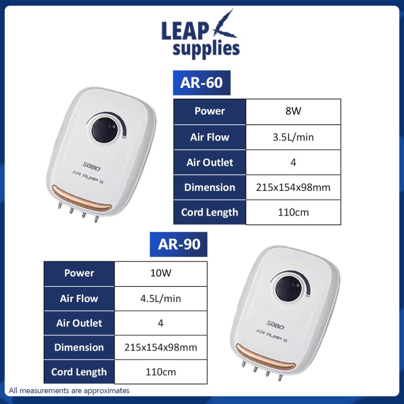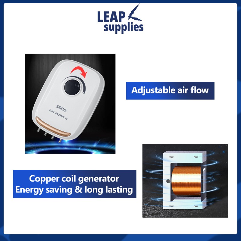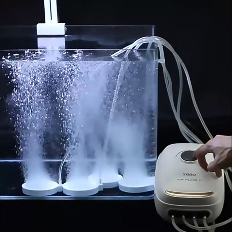 The new and improved SOBO Air Pump V3 is small and powerful. It keeps your tank oxygenated with multiple air outputs while being relatively quiet (as low as 30 dB while in operation). This air pump is energy efficient and can operate continuously for 24 hours a day without overheating.